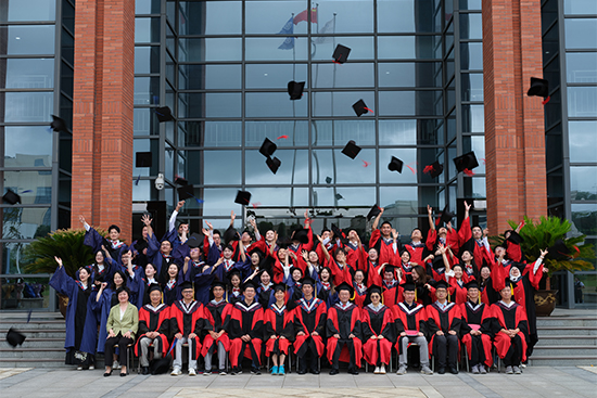 最后,研究所學位評定委員會的委員們為畢業生扶正流蘇、頒發畢業證書,合影留念。