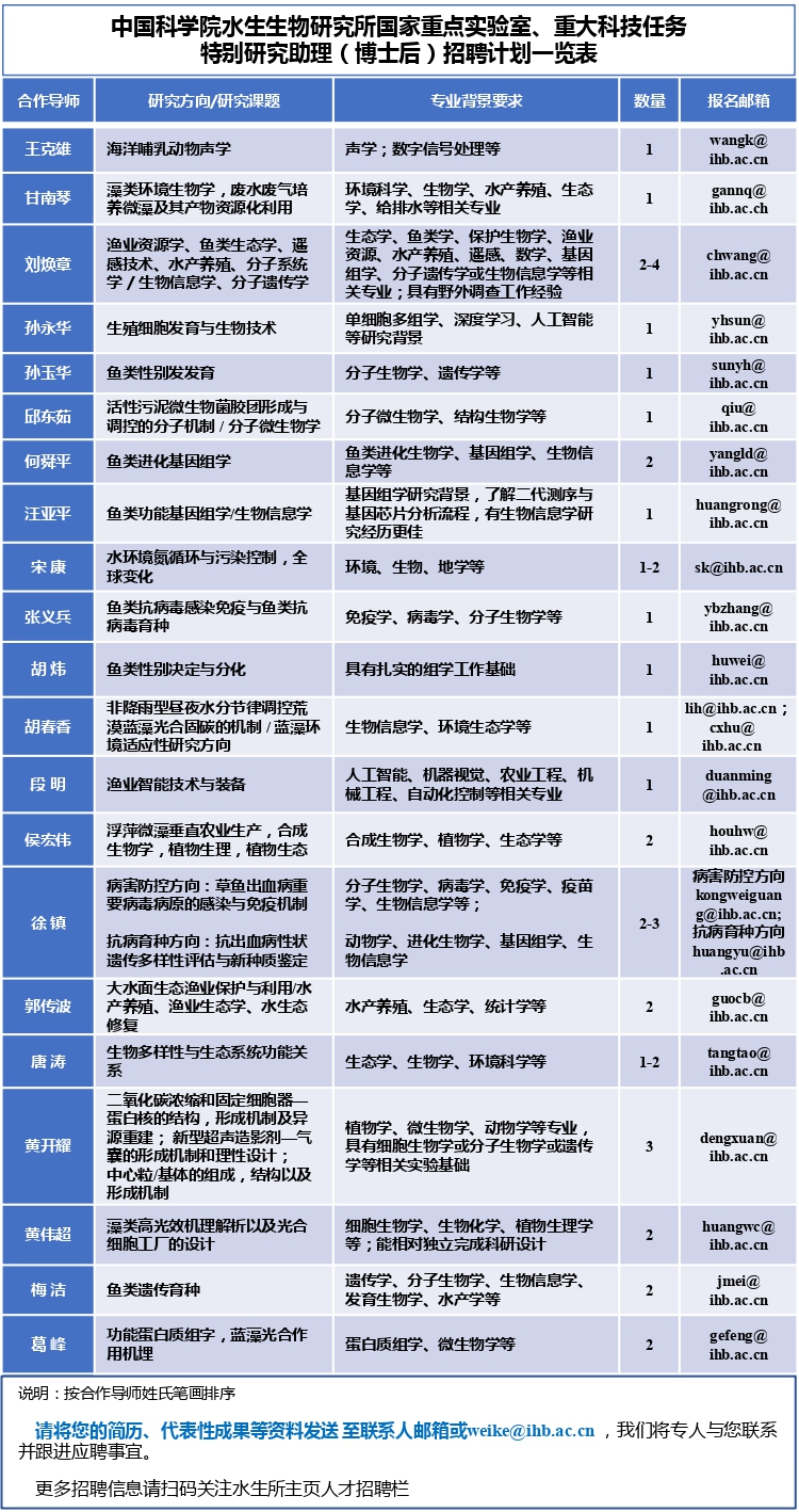 水生所常年招收特別研究助理(博士后),歡迎您隨時報名咨詢。我們即時受理,集中組織實施招聘面試。